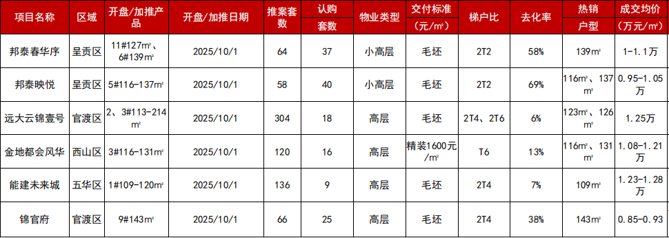 国庆期间,邦泰春华序、邦泰映悦、远大云锦壹号、金地都会风华、能建未来城、新希望·锦官府共计有6个项目开盘和加推。
