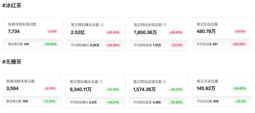 据千瓜数据显示,小红书上过去 90 天,仅“冰红茶”这一个话题词新增的相关笔记数量,就达到“无糖茶”的一倍多,话题曝光和互动量也远超后者。
