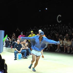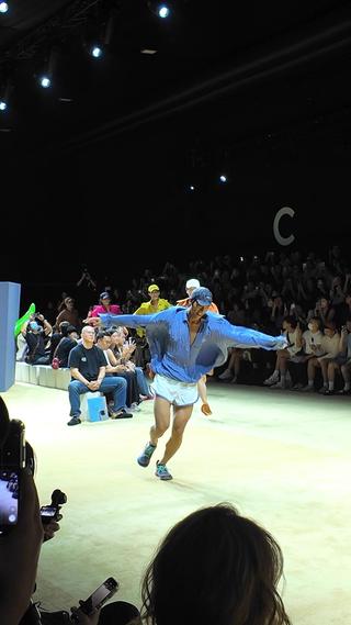 8ON8 SS26 系列以“奔跑者与梦想者”为主题,在品牌八周年之际,继续构建龚力标志性的超现实主义世界。秀场开篇与结尾,模特们在空间里自由奔跑,将“逐梦”具象化为肢体语言,也让秩序与荒诞之间的张力直观可见。场景中高楼、村屋与巨型植物交织,虚构出一个热烈而和谐的理想城邦。服装设计则融入城市路跑文化与传统手工艺:缩褶刺绣、手工编织皮质跑鞋与实验性剪裁,在陶土红与霓虹色的碰撞中平衡松弛与动感。
