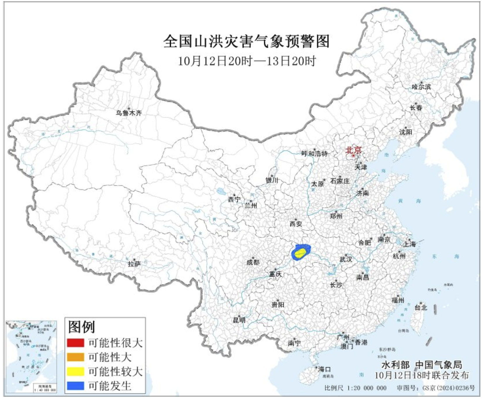 水利部和中国气象局10月12日18时联合发布黄色山洪灾害气象预警:预计,10月12日20时至13日20时,湖北西部、重庆东北部、陕西南部等地部分地区可能发生山洪灾害(蓝色预警),其中,湖北西南部、重庆东北部局地发生山洪灾害可能性较大(黄色预警)。其他地区也可能因局地短历时强降水引发山洪灾害,请各地注意做好实时监测、防汛预警和转移避险等防范工作。