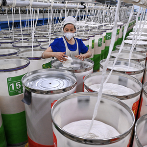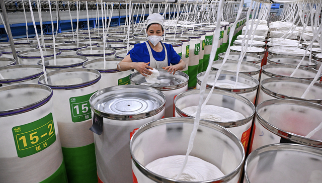 2025年10月11日,四川眉山,仁寿县金鹅纺织有限公司生产车间内,工人正在生产线上赶制出口订单。图片来源:CFP