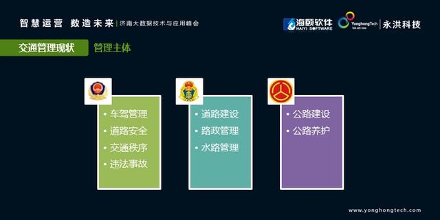 包括做车辆和驾驶人的全生命周期管理、道路安全管理、交通秩序的整治、管理以及疏导,违法以及事故的处理、预防等。这是公安这条线上,公安交警行业所要管理的。