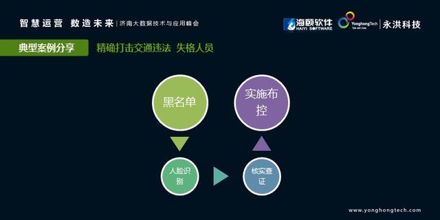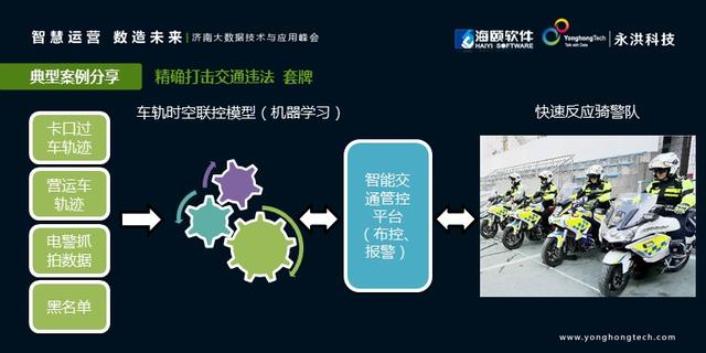 我们发现交通违法越来越呈现知识化,也就是说这些违法人员越来越聪明了。为防止此类情况,我们对每一个人会有一个精确的刻画,通过他的行车轨迹、电子眼抓拍数据、“泉城行”+App、公众服务平台等数据,放到“车轨时空联控模型”里面。这个模型会通过数据画像,会判断车辆是否是套牌。如果是套牌车,它会输入到我们智能交通管控平台,也就是说这个平台是我们大数据平台的布控模块。最后,结合济南市现在成立的快速反应骑警队,迅速布控。对交通违法驾驶人这块,我们通过画像数据生成黑名单,通过人脸识别,最后查证,进行布控,最后抓获。