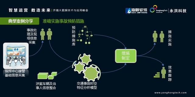 之后,结合事故车辆和当事人的信息,对他的交通违法、交通行为,以及描述的一些标签,把这些数据放到我们“交通事故时空特征预警分析模型”当中,结合事故预防措施库,制定好措施,推送到我们的指挥中心;告诉指挥中心具体在哪个路口查什么车,在哪个路口设置交通护栏等一些具体措施。
