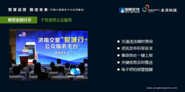 现在济南对于公众服务推出了一个公众服务平台,包括“泉城行”+App、微信公众号。我们现在后台是通过大数据支撑,以及互联网数据,做到交通违法的随时查询、违法缴纳、快速便捷、咨询发布以及听取对我们的诉求和投诉等。交通快处、关键信息推送、就是个性化推送,以及电子抓拍的预警提醒。现在我们想努力把重点路口实现违章停车,在10分钟内给大家发布预警提醒。