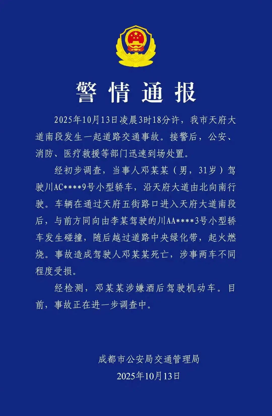 13日下午,成都市公安局交通管理局的一份警情通报显示:2025年10月13日凌晨3时18分许,我市天府大道南段发生一起道路交通事故···经初步调查,当事人邓某某(男,31岁)驾驶川AC****9号小型轿车···与前方同向由李某驾驶的川AA****3号小型轿车发生碰撞,随后越过道路中央绿化带,起火燃烧,事故造成驾驶人邓某某死亡···经检测,邓某某涉嫌酒后驾驶机动车。