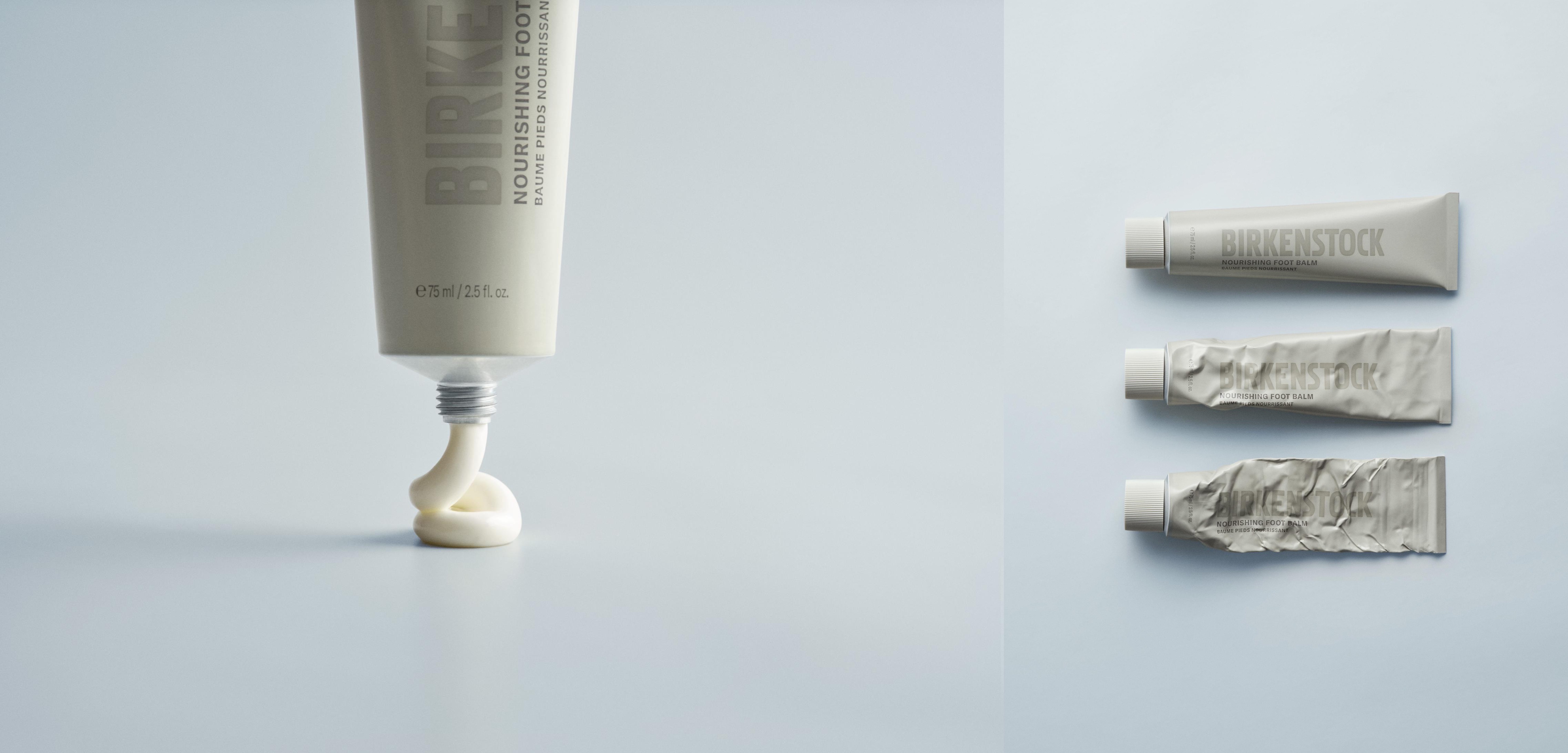 BIRKENSTOCK CARE ESSENTIALS 系列在包装设计上遵循极简、可持续且高度实用的原则。其软管和玻璃瓶分别采用 100% 再生铝和 100% 可回收玻璃制成,均在德国制造;折叠盒通过 FSC 认证,确保包装材料源自可持续管理的森林资源。所有包装材料均在德国采购与制造,严格遵循德国工艺标准,为消费者提供高品质的产品体验。