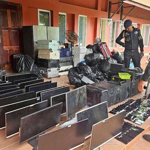 (资料图)2025年7月17日,柬埔寨干丹省,军事警察查看在一次突袭诈骗中心行动中查获的电脑、智能手机及其他设备。来源:视觉中国