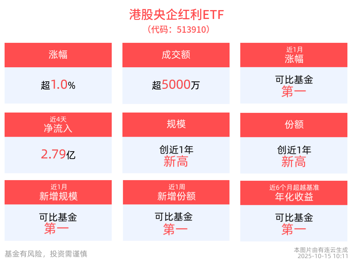 业内分析,防御性配置需求上升及政策端多重利好(如健康险创新和非车险'报行合一'规范)或是主因。据国家金融监督管理总局,2Q25保险资金运用余额(股票+证券)增速已至42.1%,近4季度增速明显提速。险资作为中长期资金的典型代表,一直以来,青睐红利类资产。股息率高、分红稳定,红利龙头仍为优选方向。中信证券研报称,复盘历史,2025Q4或成为红利股底部布局、获取超额收益的关键时点之一,目前基本面悲观预期或已充分反映。2025年以来10年期国债利率维持1.6%~1.9%,典型公路标的样本2025E A/H股息率已达5%/6.5%,提前布局或为利差最大化的重要手段。港股央企红利ETF(513910)跟踪的中证港股通央企红利指数,是在港股通范围内,从在港上市的中央企业中,挑选高股息标的,由此打包成一篮子股票。截至10月13日数据,其第一大重仓行业是银行,权重20.42%,第二大重仓行业是交运,权重15.55%,第三大重仓行业是非银金融,权重12.03%。前三大重仓行业均是低估方向。