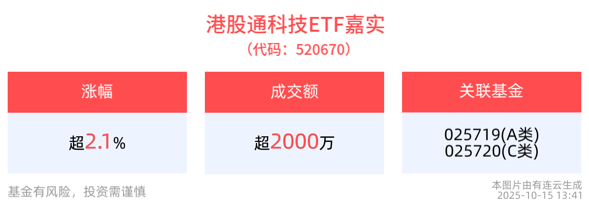 截至2025年10月15日 13:41,港股通科技ETF嘉实(520670)上涨2.17%,盘中换手11.09%,成交2348.11万元,市场交投活跃。成分股方面,黑芝麻智能涨超9%,商汤-W涨超5%,华虹半导体、优必选、哔哩哔哩-W等涨超4%。