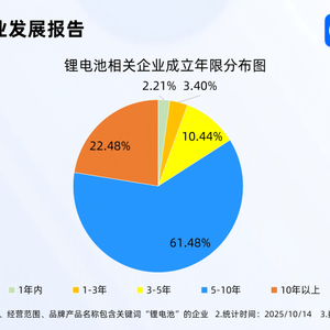 我国锂电池产业正迎来新一轮发展机遇。企查查最新数据显示,截至2025年10月14日,国内现存锂电池相关企业1.73万家,其中成立年限在5-10年的企业占比最高,达61.48%。