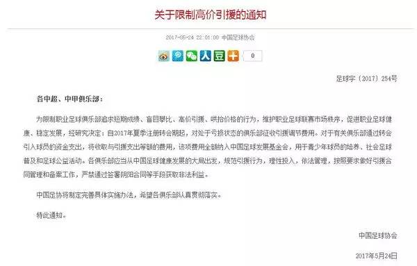 不过就在“中国德比”打完后,足协突然发布公告:规范内外援引进,并征收调节费用。足协表示这个政策是为限制职业足球俱乐部追求短期成绩、盲目攀比、高价引援、哄抬价格的行为。