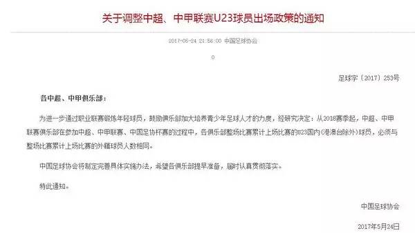 足协还同时发布了下赛季U23新政策。从2018赛季起,中超、中甲联赛俱乐部在参加中超、中甲联赛、中国足协杯赛的过程中,各俱乐部整场比赛累计上场比赛的U23国内(港澳台除外)球员,必须与整场比赛累计上场比赛的外籍球员人数相同。