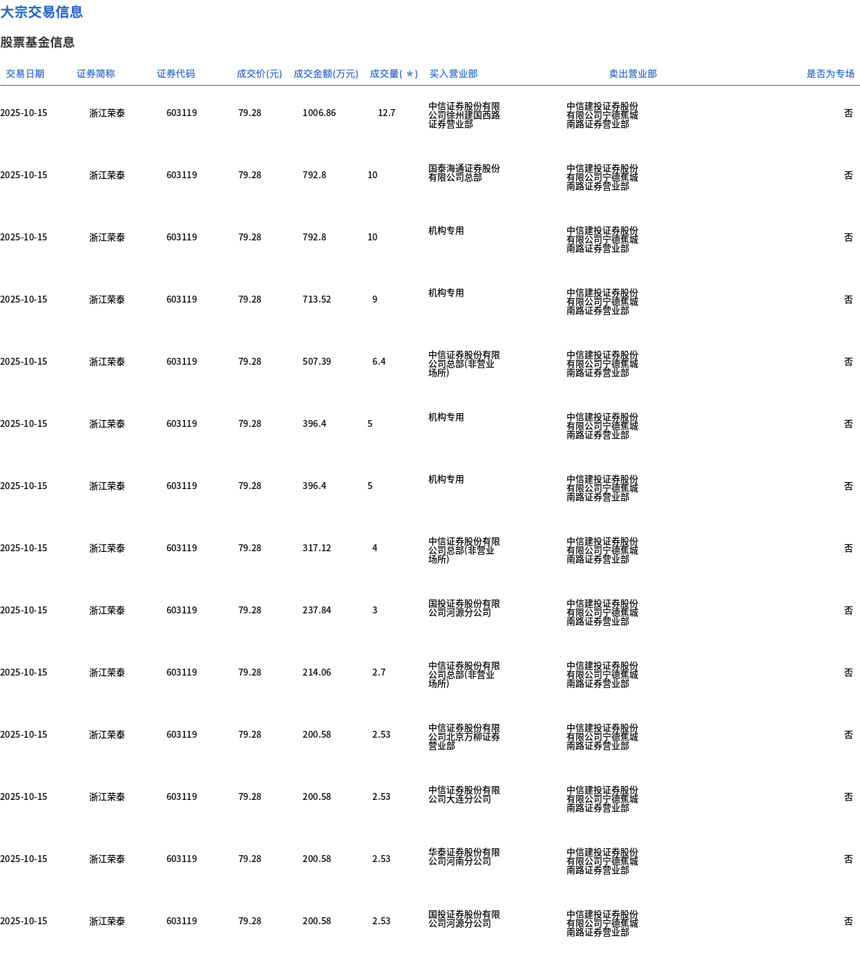 10月15日,浙江荣泰大宗交易成交77.92万股,成交额6177.51万元,占当日总成交额的3.23%,成交价79.28元,较市场收盘价93.84元折价15.52%。