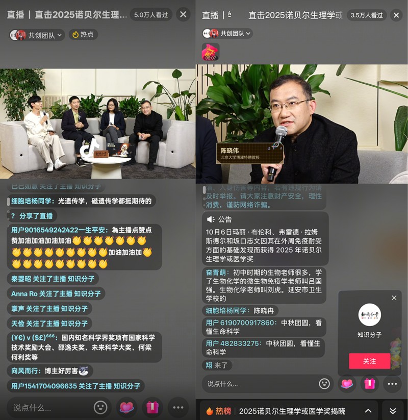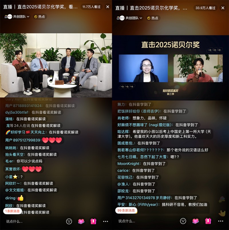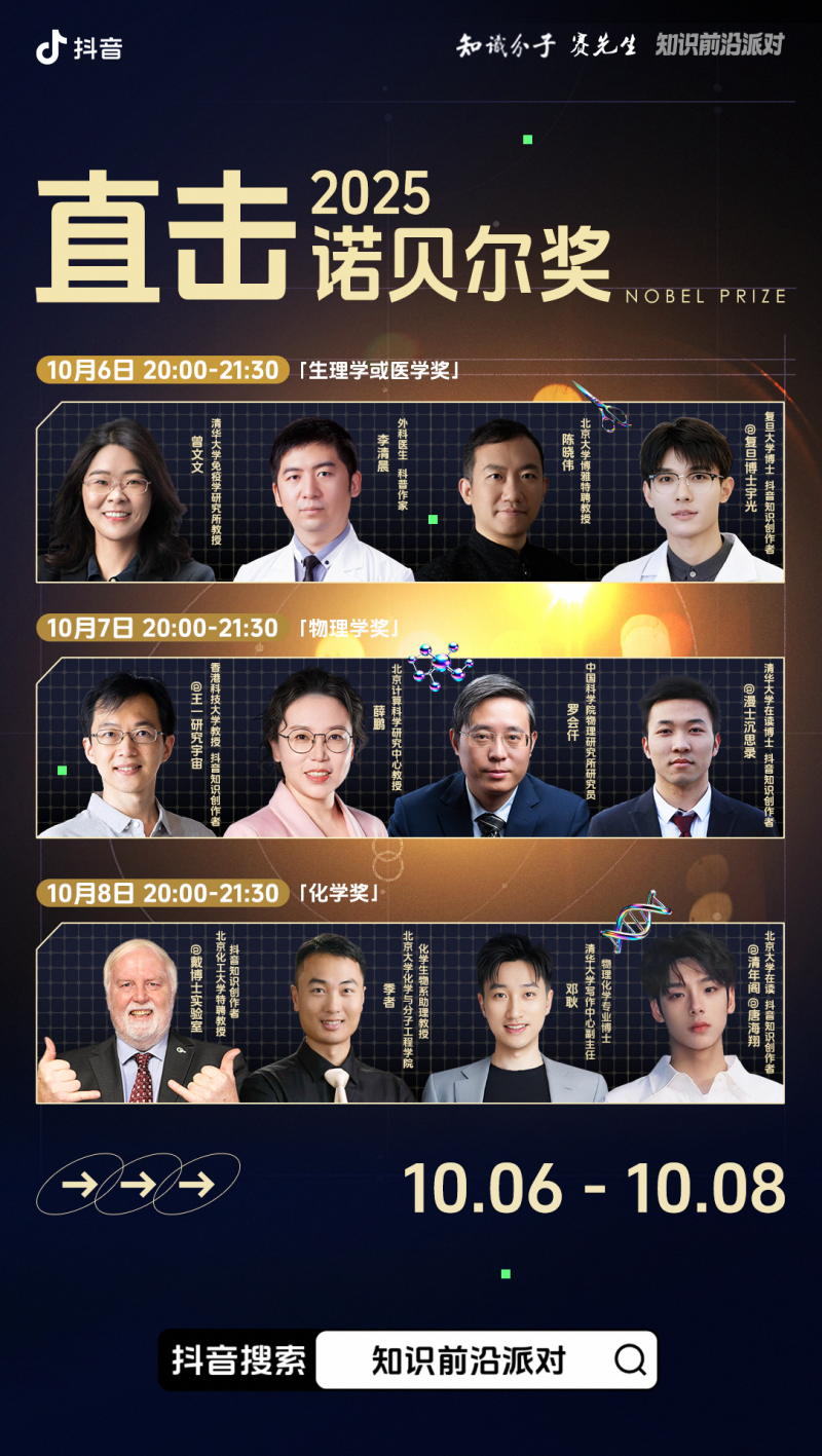 10月6日-8日,2025年诺贝尔奖自然科学三大奖——生理学或医学奖、物理学奖、化学奖陆续揭晓。抖音知识联动“知识分子”“赛先生”两大机构,连续三天进行科普直播。直播中,来自抖音平台上的三位青年创作者,与十余位院士、诺奖评委、教授、学者对话或连线,即时解读相关科学知识,三场直播累计吸引了超百万用户在线观看。