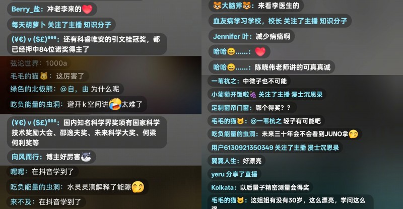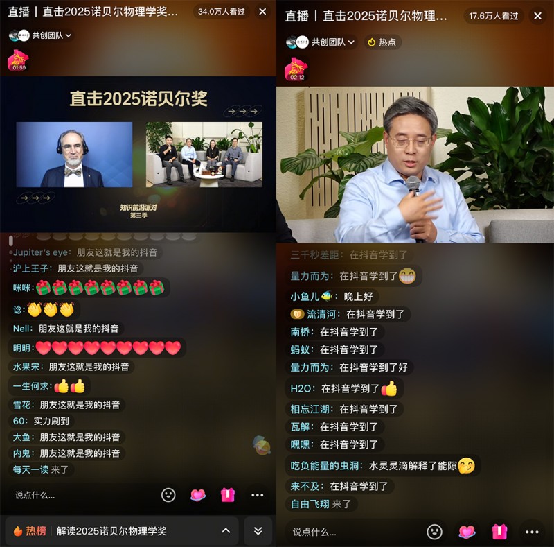 三场直播吸引了超百万人次在线观看。不少网友留言:“在抖音学到了”“朋友这就是我的抖音”“虽然听不懂,但是有这样的直播间,挺高兴的”。其中不乏一些专业留言和探讨,如“先把全部数据做成规则库,虚拟环境下模拟实验最后递归状态机下判定结果”“国内知名科学界奖项有国家科学技术奖励大会、邵逸夫奖、未来科学大奖、何梁何利奖等”“没有名和利的爱好追逐才能成功”等。相关话题如“直击诺贝尔物理学奖投票现场”“2025诺贝尔生理学或医学奖揭晓”“量子隧穿是什么”等频频登上抖音热榜。