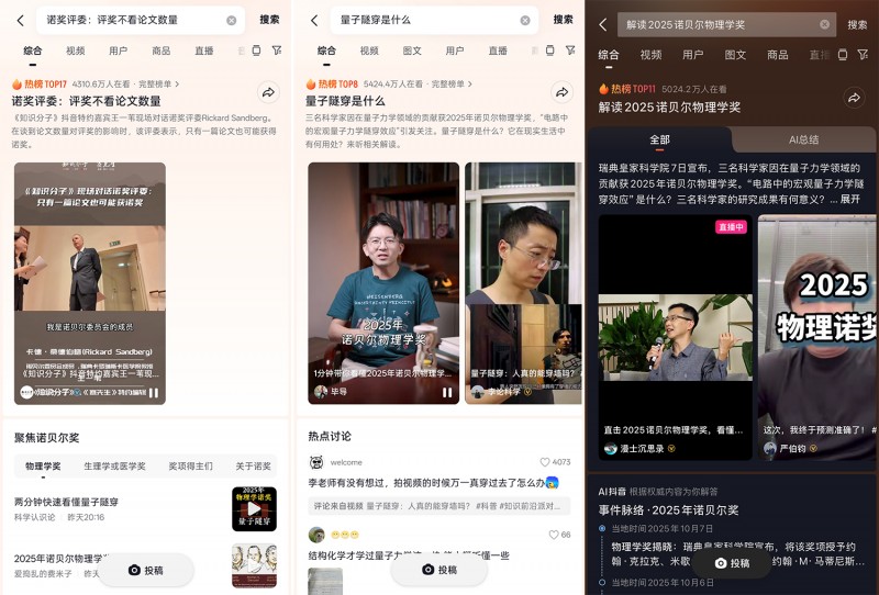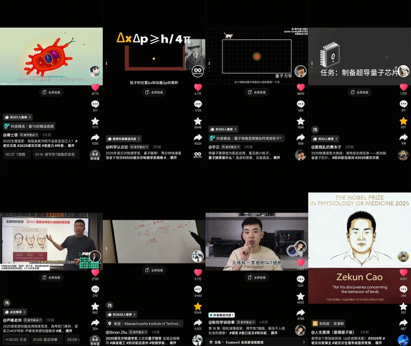 据悉,抖音连续5年邀请专家做诺奖解读。今年诺奖发布期间,抖音特约嘉宾王一苇连续三天深入诺贝尔奖新闻发布会,揭晓诺奖颁发第一现场,提问诺奖得主,为网友带来了更多一手信息。@毕导 @爱捣乱的费米子 @芦峰老师 等科普创作者也第一时间发布科普视频,向网友讲解相关科学知识。这些内容激发了网友的科学讨论热情,多个话题登上抖音热榜。