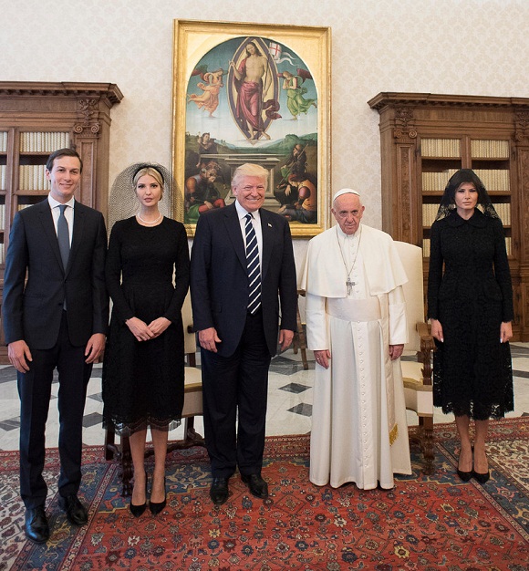 特朗普还向方济各介绍了第一夫人梅拉尼娅、特朗普的大女儿伊万卡和女婿库什纳。梅拉尼娅和伊万卡均遵照了梵蒂冈关于女性面见教皇时的着装原则,身穿长袖黑过膝裙子、头戴黑纱。