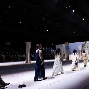 在这样的“海洋”舞台中,抖音以AI数据洞察捕捉当下的风格趋势,并将其转译为色彩、廓形与面料的灵感源泉。新生代设计师则以碧蓝欧根纱、蓝白花呢等材质,把数据化的趋势具象化为从浅滩至深海的渐变色谱,借助立体剪裁、薄透层叠与流苏元素,让服装如海水般流动。
