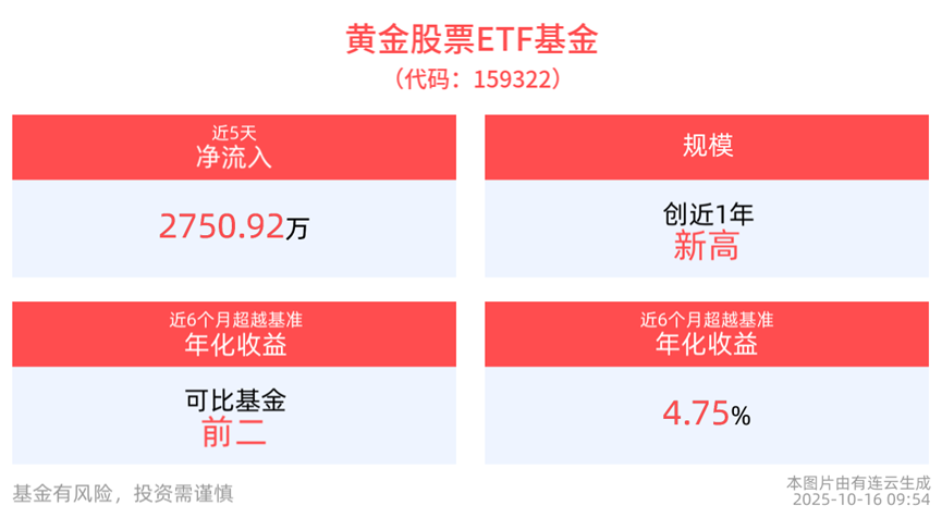 截至2025年10月10日,黄金股票ETF基金近1年夏普比率为1.84,排名可比基金前2/6,同等风险下收益更高。