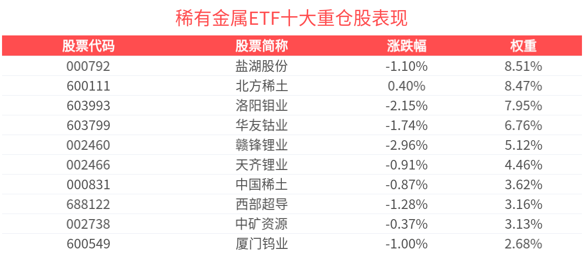 数据显示,截至2025年9月30日,中证稀有金属主题指数前十大权重股分别为北方稀土、洛阳钼业、华友钴业、盐湖股份、赣锋锂业、天齐锂业、中国稀土、中矿资源、盛和资源、西部超导,前十大权重股合计占比59.91%。