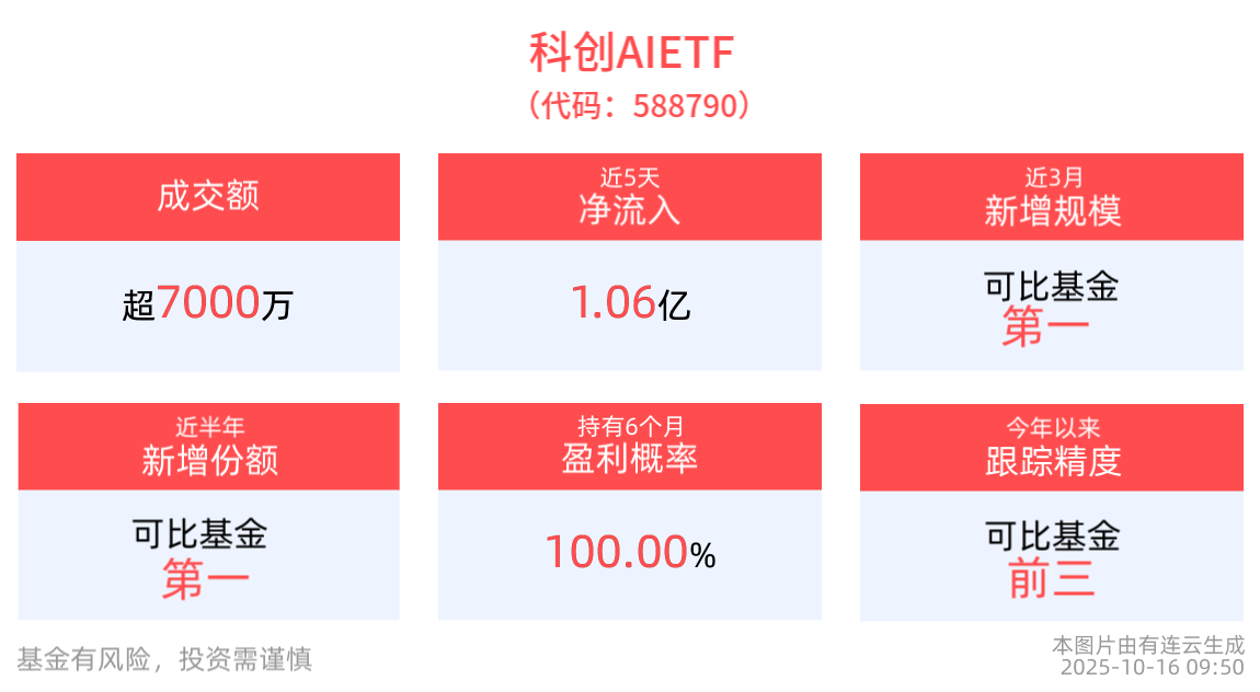 流动性方面,科创AIETF盘中换手1.09%,成交7298.34万元。拉长时间看,截至10月15日,科创AIETF近1月日均成交6.99亿元,居可比基金第一。