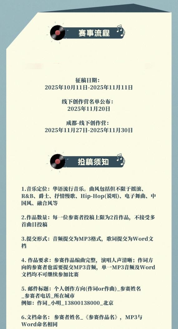 第二届“石破天惊华流词曲创作大赛”征稿日期为2025年10月11日至11月11日,参赛者可通过官方投稿邮箱touchmp@taihe.com提交作品。2025年11月20日,将公布第一轮20强选手入围名单。随后第二轮将由两位评审老师从20强入围名单中进行筛选,并确定最终的入围选手。最终入围的优秀选手将获邀前往参加于2025年11月27日至30日举行的成都线下创作营,两位评审老师也将全程参与,给予最细致的创作指导。最终的冠亚季军由选手投稿作品及线下创作营创作能力的表现,由两位评审老师综合评出本次大赛的冠亚季军。