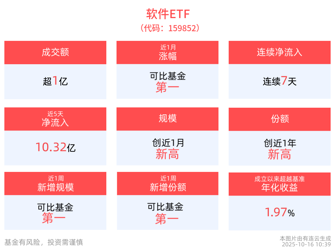 流动性方面,软件ETF盘中换手3.12%,成交1.81亿元。规模方面,软件ETF最新规模达58.72亿元,创近1月新高,位居可比基金第一。份额方面,软件ETF最新份额达63.57亿份,创成立以来新高,位居可比基金第一。