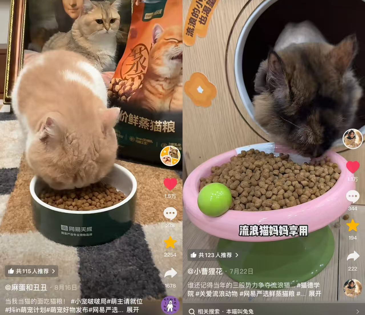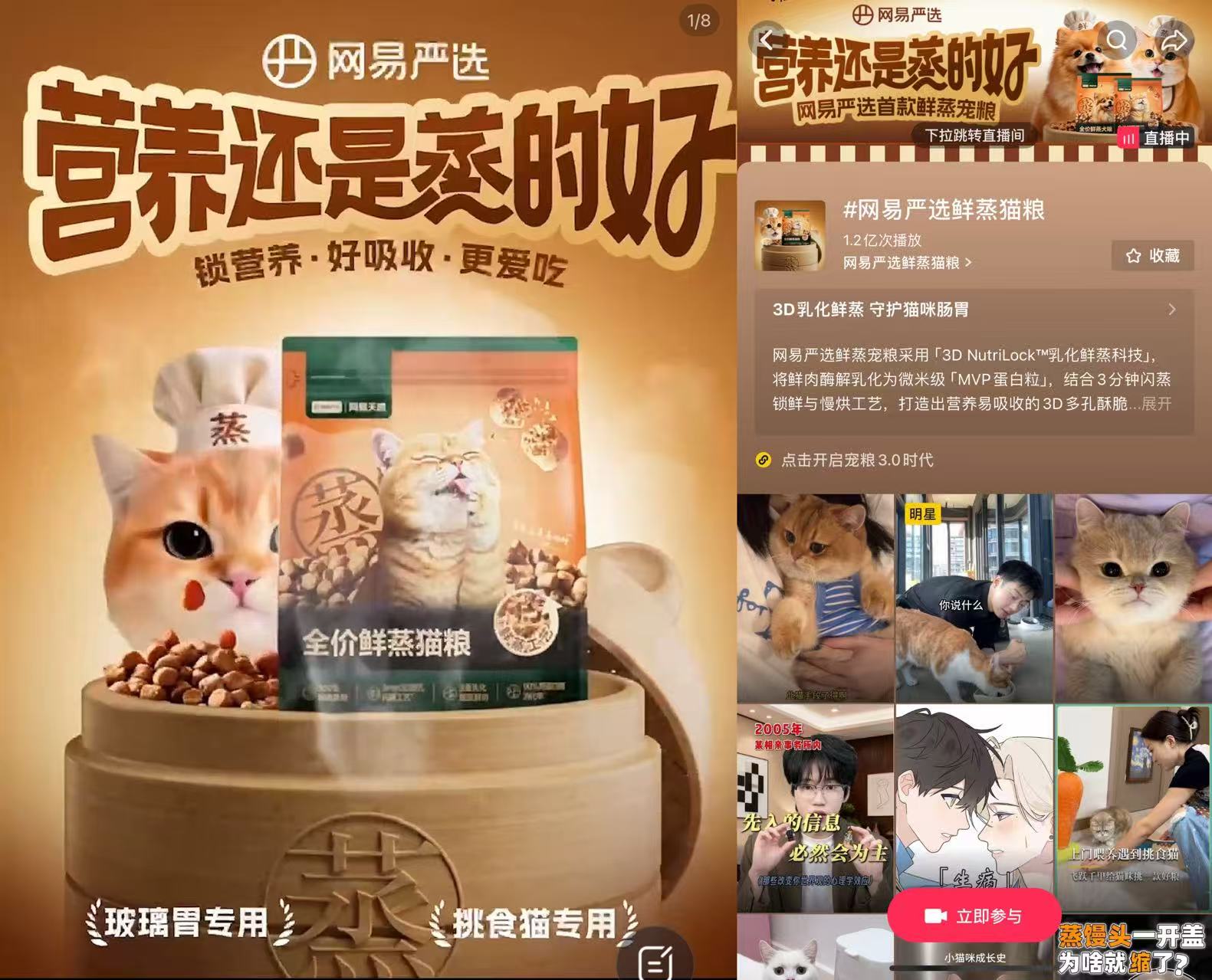 @麻蛋和丑丑 以“当着猫的面吃猫粮” 为趣味切入点,将场景从家用厨房切换到网易猫粮工厂,介绍 “网易严选鲜蒸猫粮用鲜鸡肉制作”“采用人食用级白羽鸡,经冰鲜储存、筛选合格后才投料”等原料优势,猫咪吃得放心,铲屎官也可以大胆尝试。@小曹狸花 从与流浪猫妈妈和它的孩子“XXXL号小狸花”的相识故事讲起,记录了二者的成长历程。在这一过程中,猫妈妈逐渐步入老年,适口性佳、易吞咽、营养全面成为其饮食的新需求。而网易严选全价鲜蒸猫粮凭借3d乳化鲜蒸工艺锁住营养、易消化、适合玻璃胃等优势“脱颖而出”,成功俘获猫妈妈与一众小猫的芳心。