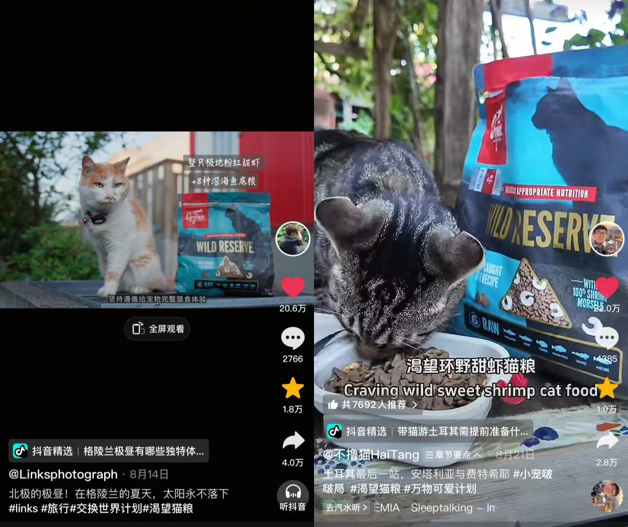 渴望本次携新品“环野极地甜虾冻干双拼猫粮” 重磅亮相。为实现新品破圈,扩大声量,品牌携手@Linksphotograph、萌宠领域头部达人@不撸猫HaiTang 等,在全平台进行联动分发与内容共创,通过食材原产地溯源、挑食猫喂养知识科普、猫咪“旅行吃播”等多元形式,将“整只极地甜虾冻干”的核心卖点生动传递给消费者,成功放大新品声量,实现破圈层曝光。爱肯拿则围绕“超20种天然食材,40年膳食专家”的品牌定位,集中放大核心爆品,通过多场景内容演绎,实现强势种草与高效转化。