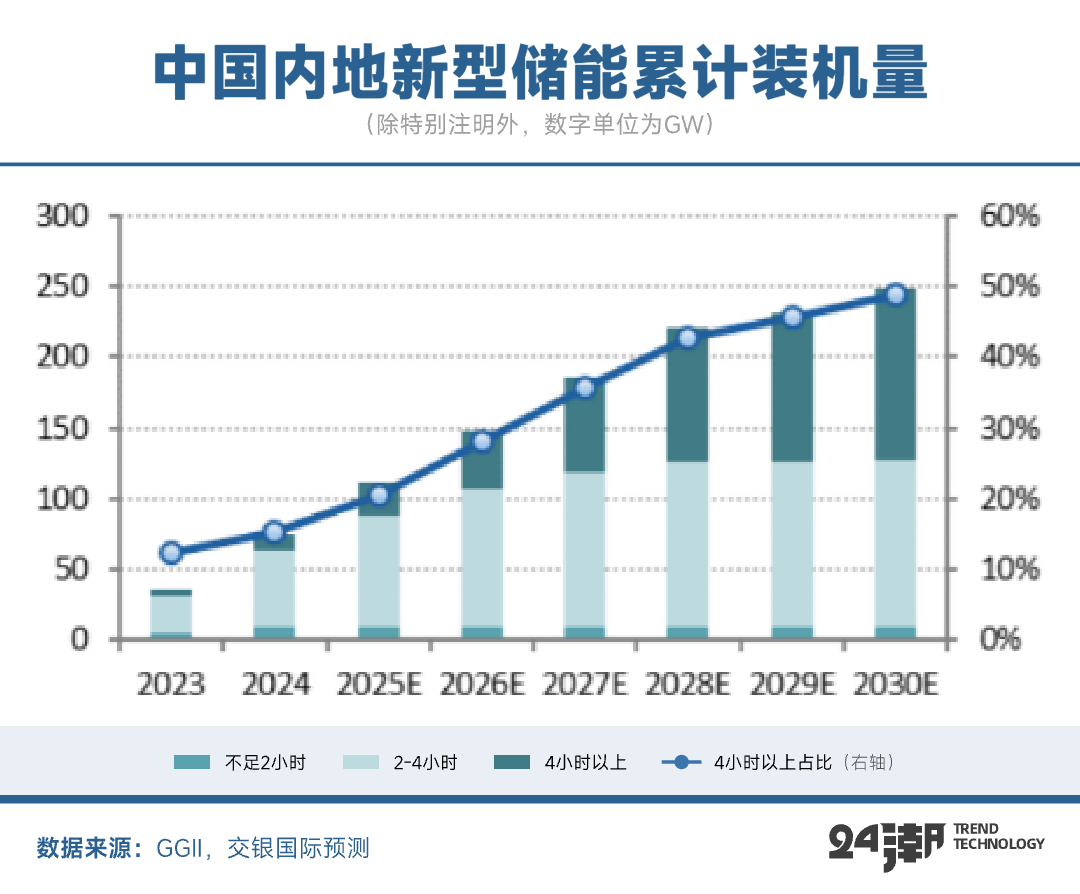 根据交银国际分析,预计2025年起国内长时储能市场将快速增长,到2025/2030年,4小时以上储能占比分别提升至21%/50%,2025-2030年4小时以上储能新增装机规模合计超100GW。