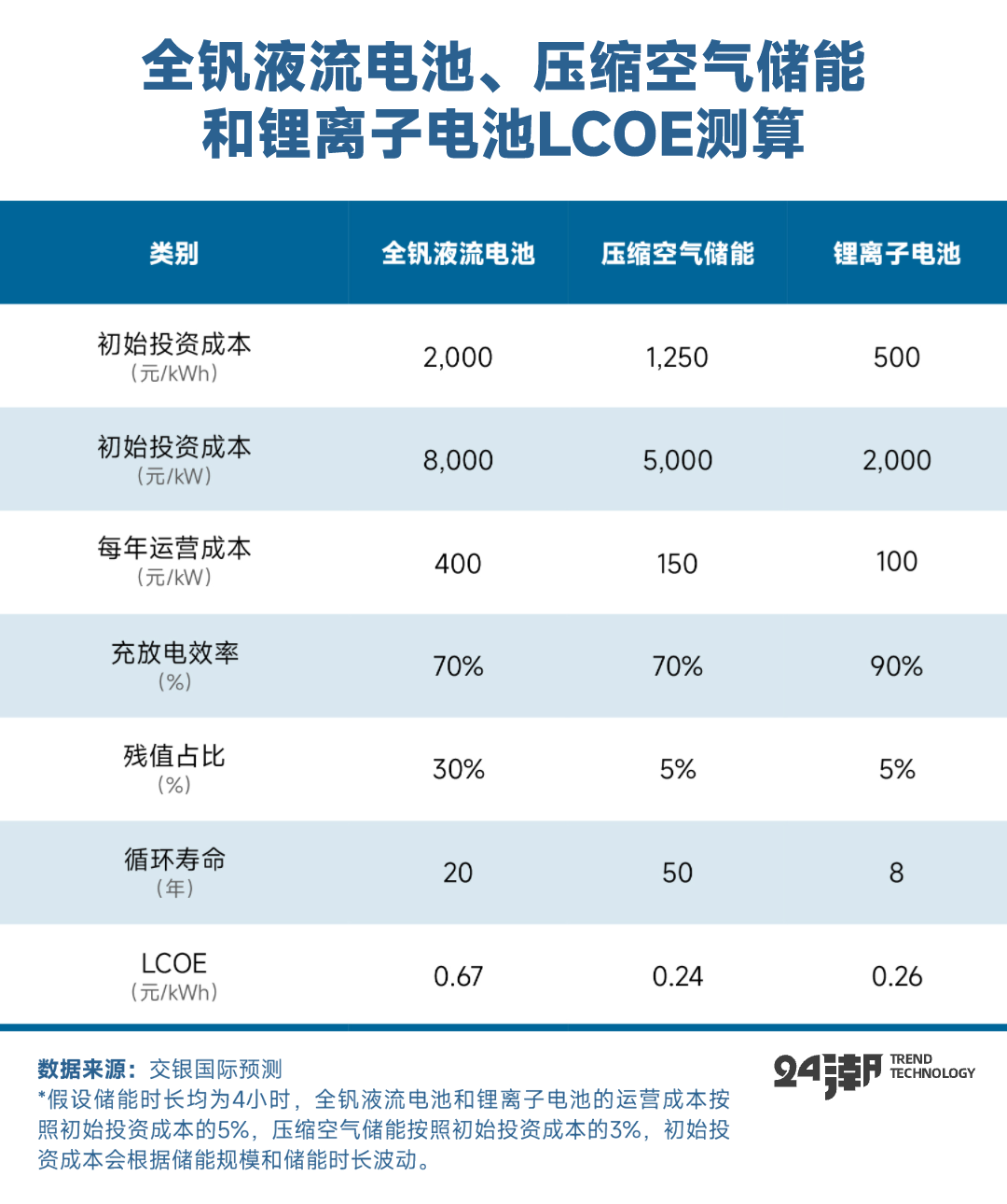根据交银国际对锂离子电池、压缩空气、液流电池三种储能技术的初始投资成本测算:在碳酸锂价格下降后,锂离子储能系统的初始投资成本已经降至500元/kWh,初始投资成本最低;其次是压缩空气储能的1250元/kWh;而液流电池的初始投资成本最高,约为2000元/kWh。