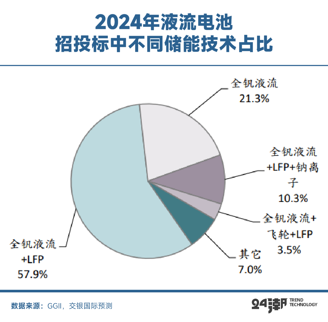 根据GGII数据,2024年液流电池招投标超3GW,其中混合储能占比超过71.8%。全钒液流电池+磷酸铁锂电池(LFP)混合储能项目占比近六成,两者结合后,既发挥液流电池长时储能和高功率的特性,又借助磷酸铁锂电池提升整体能量密度,弥补了单一储能技术在不同应用场景下的缺陷。