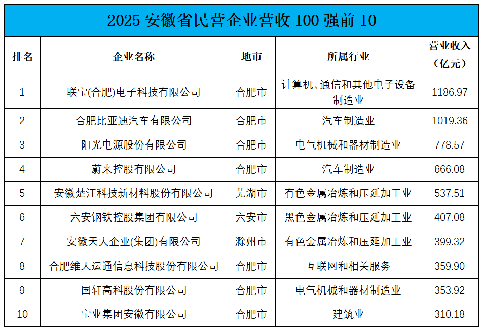 10月16日,安徽省工商联召开2025安徽省民营企业百强发布会。“营收百强”“制造业百强”“服务业百强”和“吸纳就业百强”四大榜单正式发布。在备受关注的营收百强榜单中,联宝(合肥)电子科技有限公司以1186.97亿元的营收规模蝉联榜首,合肥比亚迪汽车有限公司以1019.36亿元位居第二,阳光电源股份有限公司以778.57亿元位列第三。蔚来控股有限公司与安徽楚江科技新材料股份有限公司紧随其后,共同跻身营收前五强。