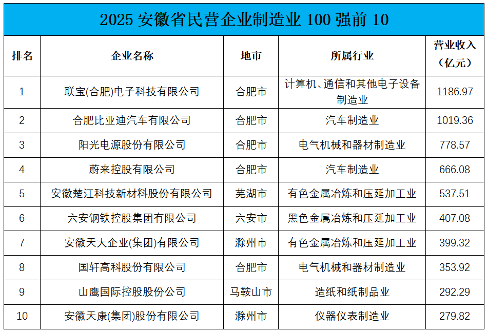 2025安徽民营企业制造业100强前10榜单