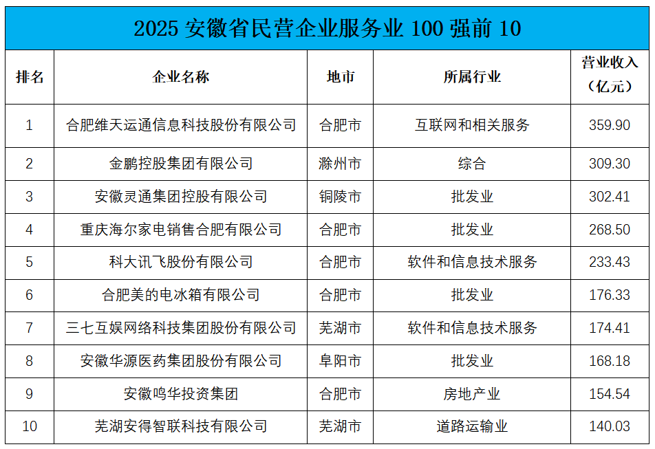 2025安徽民营企业服务业100强前10榜单