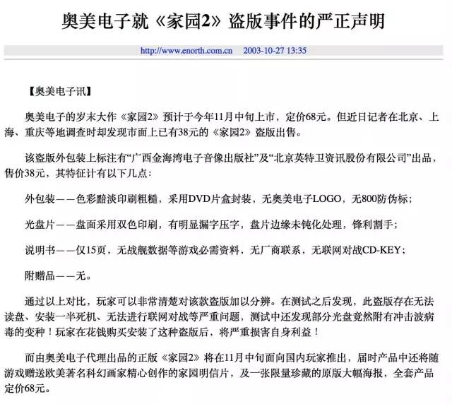 在四大系列之外,表现最好的《地球帝国2》销量只有5万,而在国内玩家中口碑极佳的《家园2》也只有2、3万的销量,很多玩过这些游戏的当时玩的都是盗版或者伪正版。比如在2003年11月《家园2》正式发售之前,市场上就出现了一批售价38元的伪正版,奥美电子专门在媒体上发表公告进行澄清,实际上也并没有太大的作用。