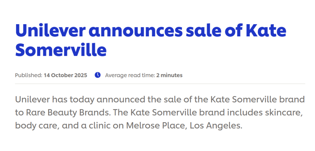 10月14日,高端护肤品牌Kate Somerville(凯诗薇)在被联合利华收购10年后,正式出售给Rare Beauty Brands。
