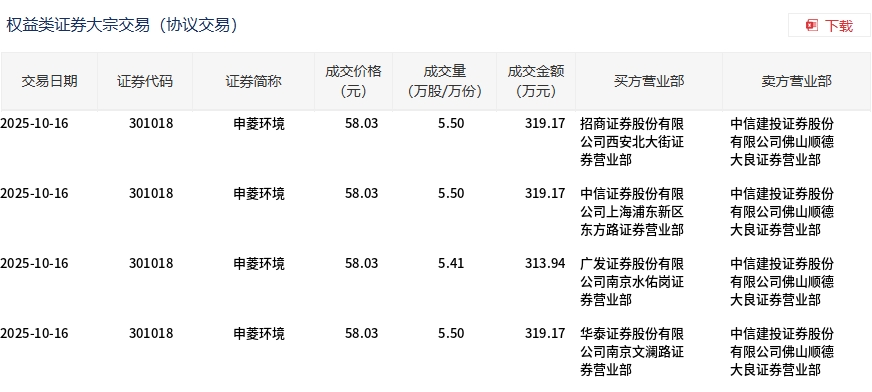 10月16日,申菱环境大宗交易成交21.91万股,成交额1271.45万元,占当日总成交额的3.31%,成交价58.03元,较市场收盘价65.2元折价11%。