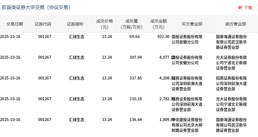 10月16日,汇绿生态大宗交易成交1042.27万股,成交额1.38亿元,占当日总成交额的32.07%,成交价13.24元,较市场收盘价14.65元折价9.62%。