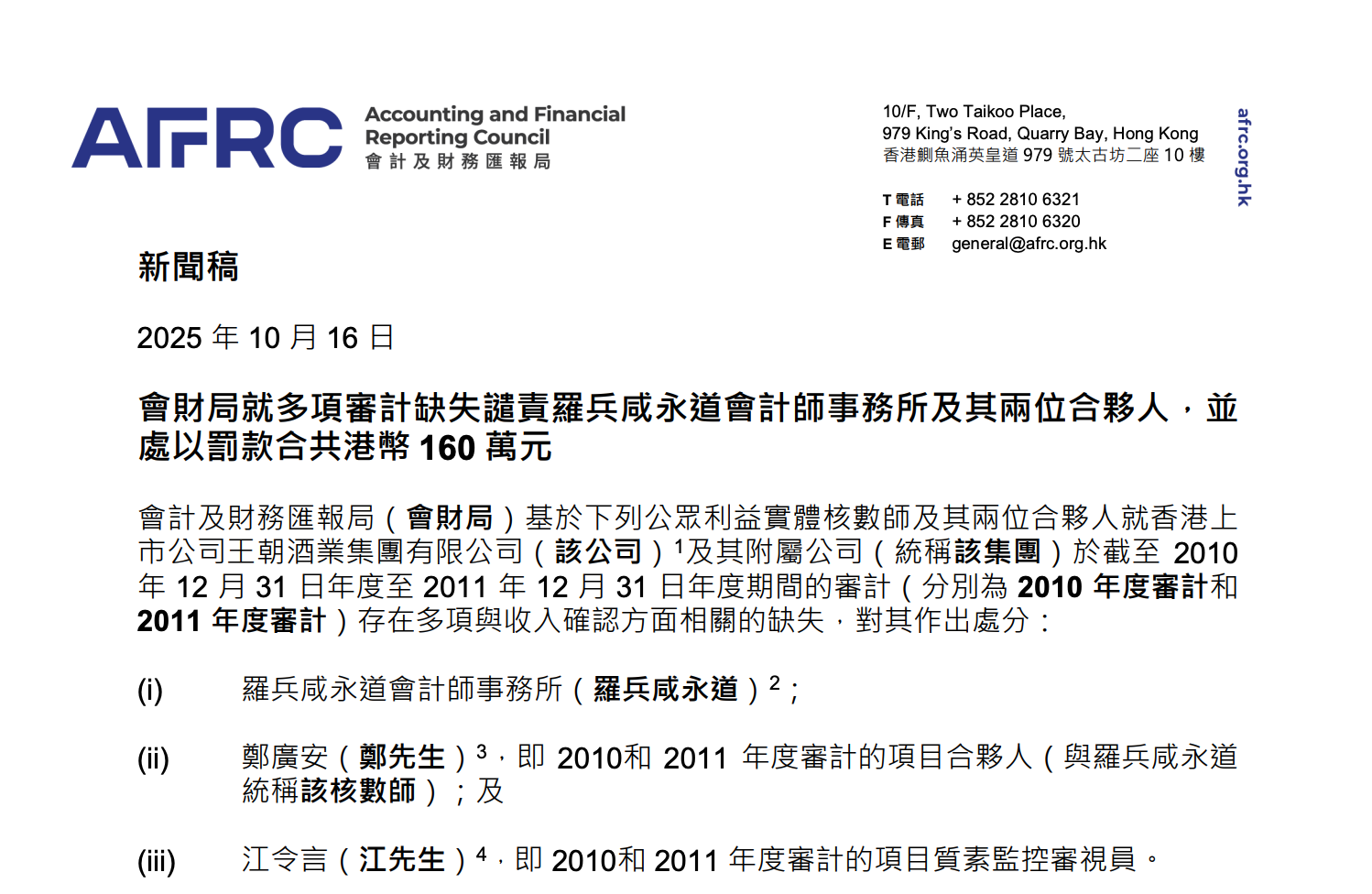 根据香港会财局公告,在2010和2011年两个年度,核数师在收入确认方面进行的审计工作存在缺失,未能就香港上市公司王朝酒业集团有限公司及其附属公司(以下简称该集团)所记录的收入取得充分适当的审计证据,导致其错误地出具无保留意见。
