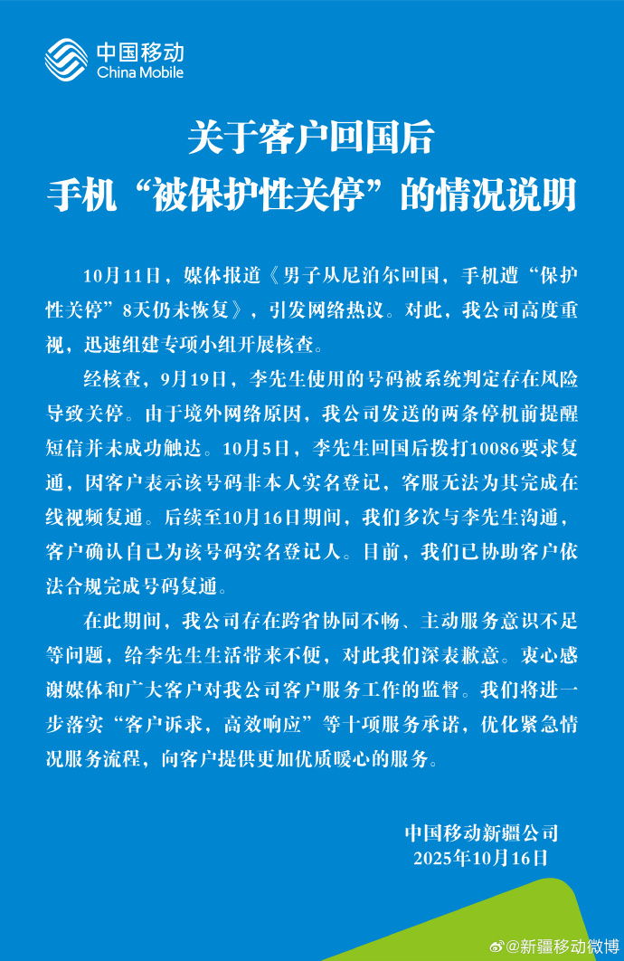 10月16日下午,中国移动新疆公司官方微信账号发布关于客户回国后手机“被保护性关停”的情况说明: