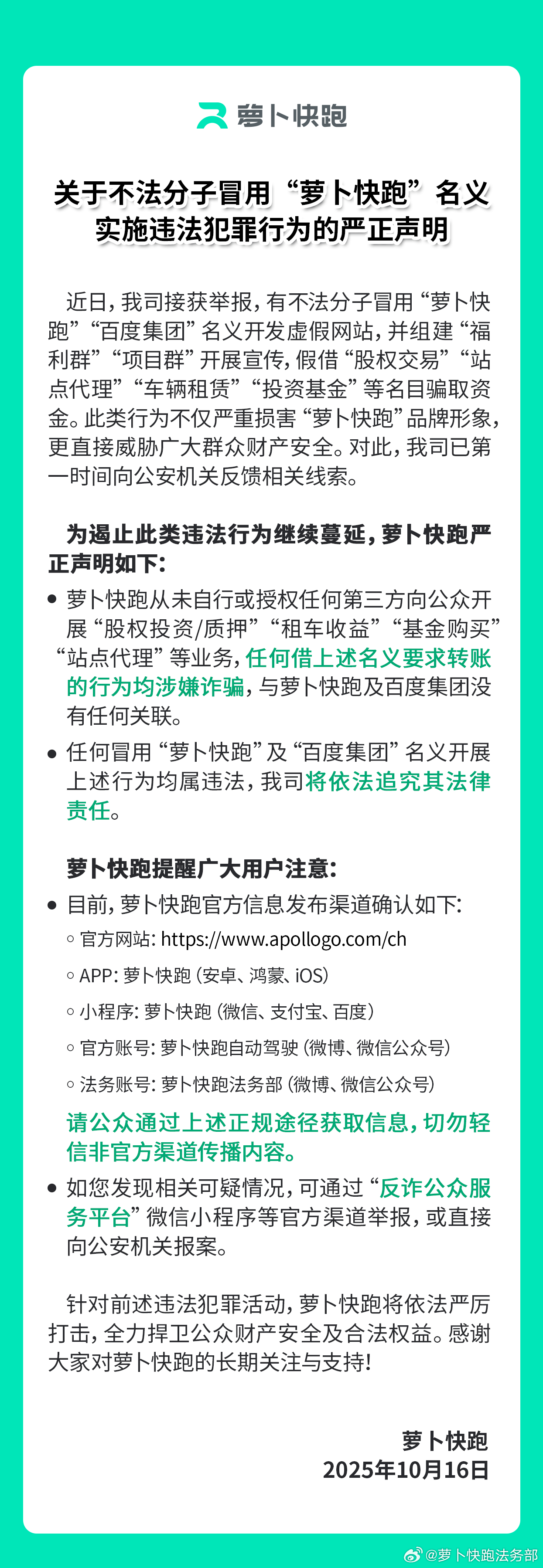 10月16日,萝卜快跑发布声明称,有不法分子冒用“萝卜快跑”名义实施违法犯罪行为。近日,公司接获举报,有不法分子冒用“萝卜快跑”“百度集团”名义开发虚假网站,并组建“福利群”“项目群”开展宣传,假借“股权交易”“站点代理”“车辆租赁”“投资基金”等名目骗取资金。此类行为不仅严重损害“萝卜快跑”品牌形象更直接威胁广大群众财产安全。对此,公司已第一时间向公安机关反馈相关线索。