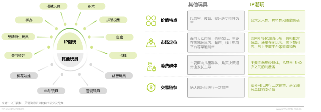 “IP潮玩” 是指具有高辨识度的独立知识产权(IP)属性的潮流玩具。区别于其他玩具,潮玩的目标受众并非儿童而主要面向成年人,因其设计和制造工艺较为考究而通常具有较高的观赏性和艺术价值。与其他传统玩具不同,潮流玩具不一味追求可玩性或教育性,但具有一定收藏及潮流属性,且因为IP的赋能,IP潮玩容易在网络上引起高话题度和影响力。