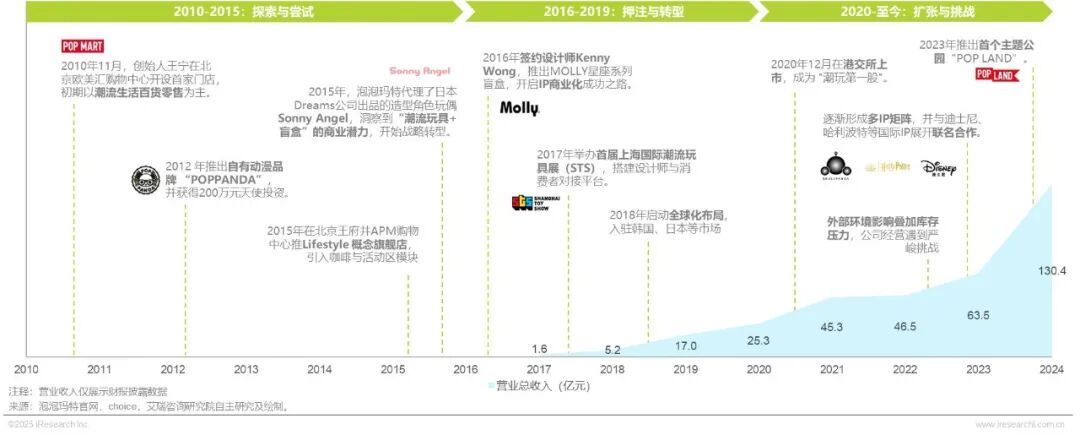 泡泡玛特自2010年成立以来,历经从潮流零售到IP商业化的战略转型。2016年签约设计师Kenny Wong推出MOLLY盲盒系列,开启爆发式增长,2020年在港交所上市成为“潮玩第一股”。2020-2022年期间,公司线下业务遭受重创,通过加速机器人商店布局和线上渠道拓展,实现逆势增长。面对2022年盲盒监管新规,泡泡玛特推出明盒产品和保底机制。2023年后深化全球化与文化赋能,2025年作为首个中国潮玩品牌登陆卢浮宫参展,展现出强大的成长韧性与创新能力。
