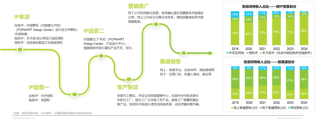 泡泡玛特商业模式的核心在于全产业链布局。上游IP来源方面,泡泡玛特拥有自有IP、独家IP、授权IP三种类型IP,并且近年来自有及独家IP营收贡献呈现上涨态势。IP运营来看,一方面泡泡玛特会对IP进行对外授权,另一方面通过PDC进行潮玩产品设计开发;生产端来看,泡泡玛特采取代工模式,并设立供应链管理中心,并于2020年开始进行柔性供应链改革。营销端来看,泡泡玛特充分利用线上会员体系与线下展会资源,高效触达消费者。渠道端来看,泡泡玛特构建了线上线下全渠道销售网络,包括直营店、机器人商店、电商平台和自有APP等。