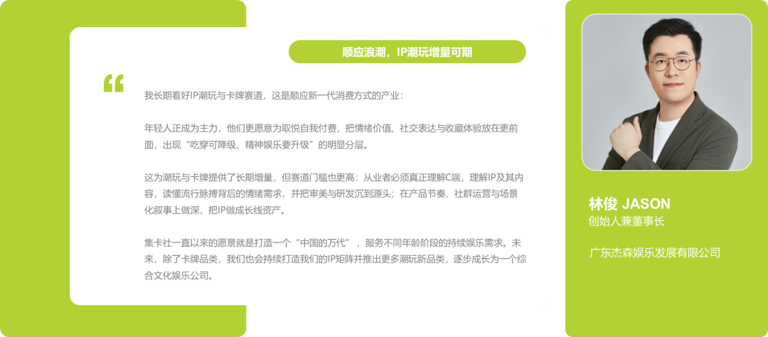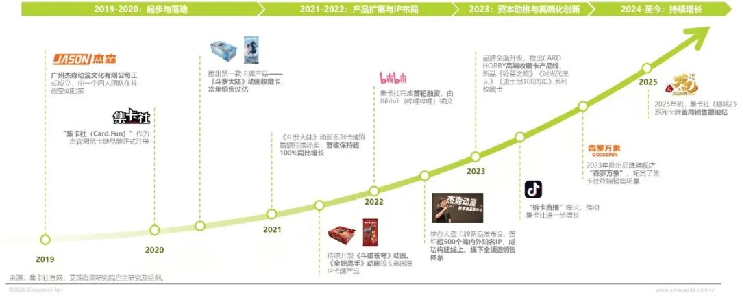 集卡社(Card.Fun)由广州杰森动漫孵化,2020年正式推出品牌并以《斗罗大陆》收藏卡切入市场,确立品牌“收藏类卡牌”定位。2021—2022年加速签约动漫/影视/游戏等头部IP,丰富产品矩阵,通过强IP授权积累品牌影响力,形成竞争壁垒。2023年在资本与渠道层面双轮驱动:获平台方领投融资、拆卡直播爆发,同时上线典藏/豪华等高端收藏线,并创立线下官方门店品牌。成立至今,杰森娱乐逐步成为一家集IP版权运营、影视及动漫内容投资、IP衍生品设计开发生产销售于一体的综合型文化娱乐集团。