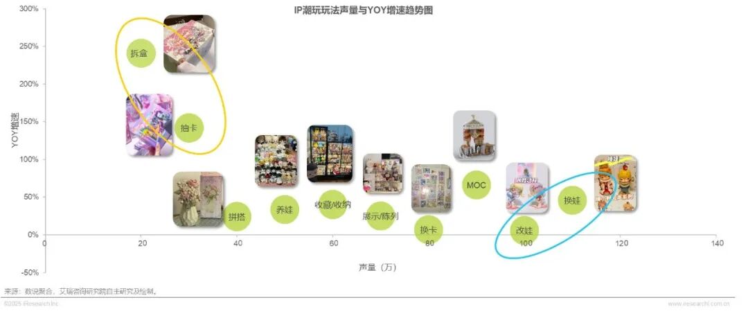 2023至2025年,IP潮玩的各类玩法在声量上有明显分层,呈现出新玩法爆发式拉动,经典玩法迭代稳固,小众玩法探索细分的格局。“换娃”“改娃”等玩法声量靠前,社媒上讨论度、基础传播量高,是潮玩IP中较受关注的基础场景;“抽卡”“拆盒”等声量虽相对靠后,传播基数较小,但增长动力强,成为IP潮玩玩法创新升级的新趋势方向。