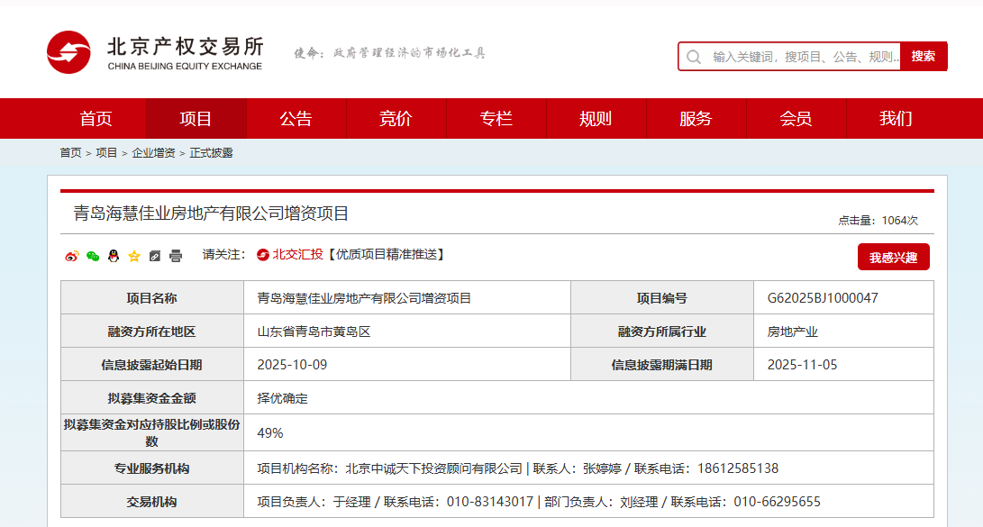 这一系列土地储备的落子,迅速转化为具体的项目推进。2025年10月,济南中海地产投资有限公司全资子公司——青岛海慧佳业房地产有限公司的增资项目,正式在北京产权交易所挂牌。此举标志着中海不再满足于简单拿地开发,而是以股权合作的方式,加速推进其在青岛西海岸的高端项目“天空之境”,进一步强化市场占位。