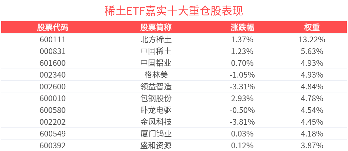 数据显示,截至2025年9月30日,中证稀土产业指数前十大权重股分别为北方稀土、卧龙电驱、领益智造、中国稀土、盛和资源、格林美、金风科技、包钢股份、厦门钨业、中国铝业,前十大权重股合计占比61.96%。